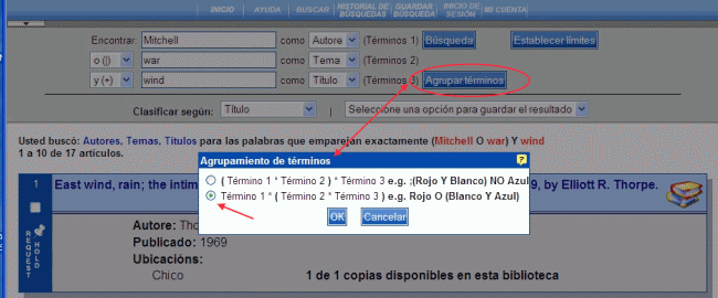 Después de escribir la primera palabra clave en el cuadro de entrada que está a la derecha de Encontrar y seleccionar la categoría para Term 1 (término 1) (Título, Autor, etc.), seleccione uno de los operadores booleanos [AND (+), OR (|), NOT (-)] (es decir, Y (+), O (|), NO (-)) para determinar la relación entre el primer término de búsqueda y el siguiente término. Si usa tres términos de búsqueda diferentes y operadores booleanos correspondientes, seleccione el botón adecuado Agrupar términos en la forma para determinar la forma en que quiere que se agrupen los términos de búsqueda.