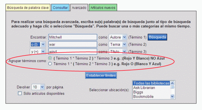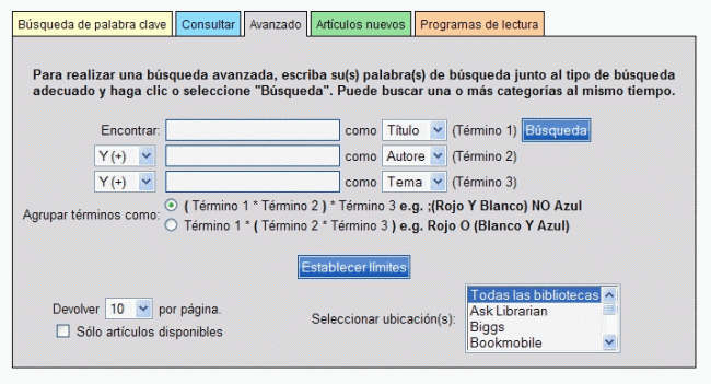 La búsqueda Avanzada le permite buscar hasta tres campos al mismo tiempo. Tiene tres cuadros de búsqueda, en lugar del cuadro único que encuentra en la Búsqueda de palabra clave. Para cada cuadro de búsqueda puede escribir sus palabras clave y seleccionar la categoría (Título, Autor, etc.) de la lista descendente.